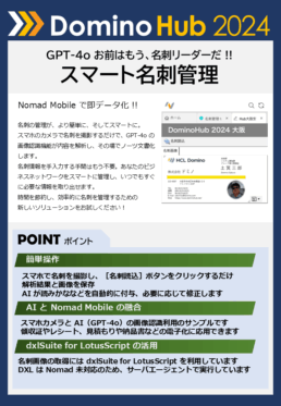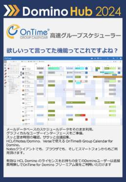 イベント申し込みはこちらから2025年9月18日(木) 展示内容セッション内容はこちら14:40 ~ 17:30 展示/体験ブース 概要 展示/体験ブース – スマートフォンで動くNotes 『NomadMobile』 – Webブラウザで動くNotes 『NomadWeb』 – ブラウザだけでローコード開発 『Domino Leap』 – V14標準搭載『OnTime Group Calender』 – 新しいNotes/Dominoで実現できるアプリ 生成AI / クラウドFAX連携 /etc and more… MC: HCL アンバサダー 展示ソリューション一覧 プロダクト ソリューション 変わり種 展示会場レイアウト図 イベント申し込みはこちらから
